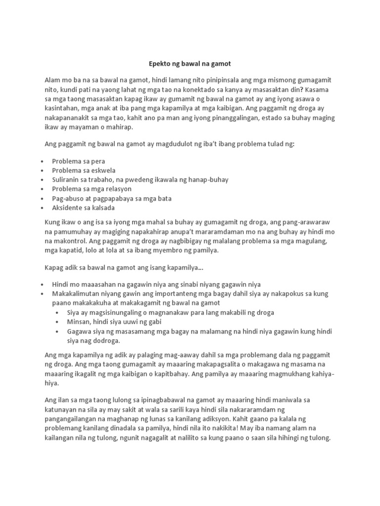 Pagsamsamahin sa isang buong konsepto ang mga sinuring impormasyon tungkol sa kalusugan panlipunang bunga ng pag-abuso sa droga at kung anu-ano ang mga negatibong epekto nito sa taong gumagamit ng mga bawal na gamot kanyang-. Ang droga ay nag dudulot ng pagkabaliw tulala halusinasyon mabilis na pagbagsak ng timbang at marami pang iba nakakasira din ito sa buhay mawawalang ka ng trabaho pera at higit sa lahat mga taong. Pagkakaroon ng problema sa pera.