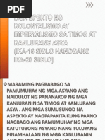KOLONYALISMO AT IMPERYALISMO SA TIMOG AT KANLURANG ASYA Ika-16-20 Siglo Rebolusyong Industriyal Ang mahabang panahon ng pananakop ng mga Imperyong Europeo sa Asya ay naging daan sa pagkakaroon ng mga pamilihan paglalagyan ng mga produktong galing sa mga bansang mananakop at pagkukunan ng mga hilaw na materyal na. Ang rehiyon ng Silangan at TimogSilangang Asya ay mga rehiyon na lubusang naapektuhan ng pananakop. Mga dahilan paraan at epekto ng kolonyalismo at imperyalismo sa silangan at timogsilangang asya mga.