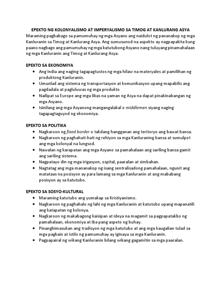 Epekto Ng Kolonyalismo At Imperyalismo Sa Timog At Kanlurang Asya Pdf
