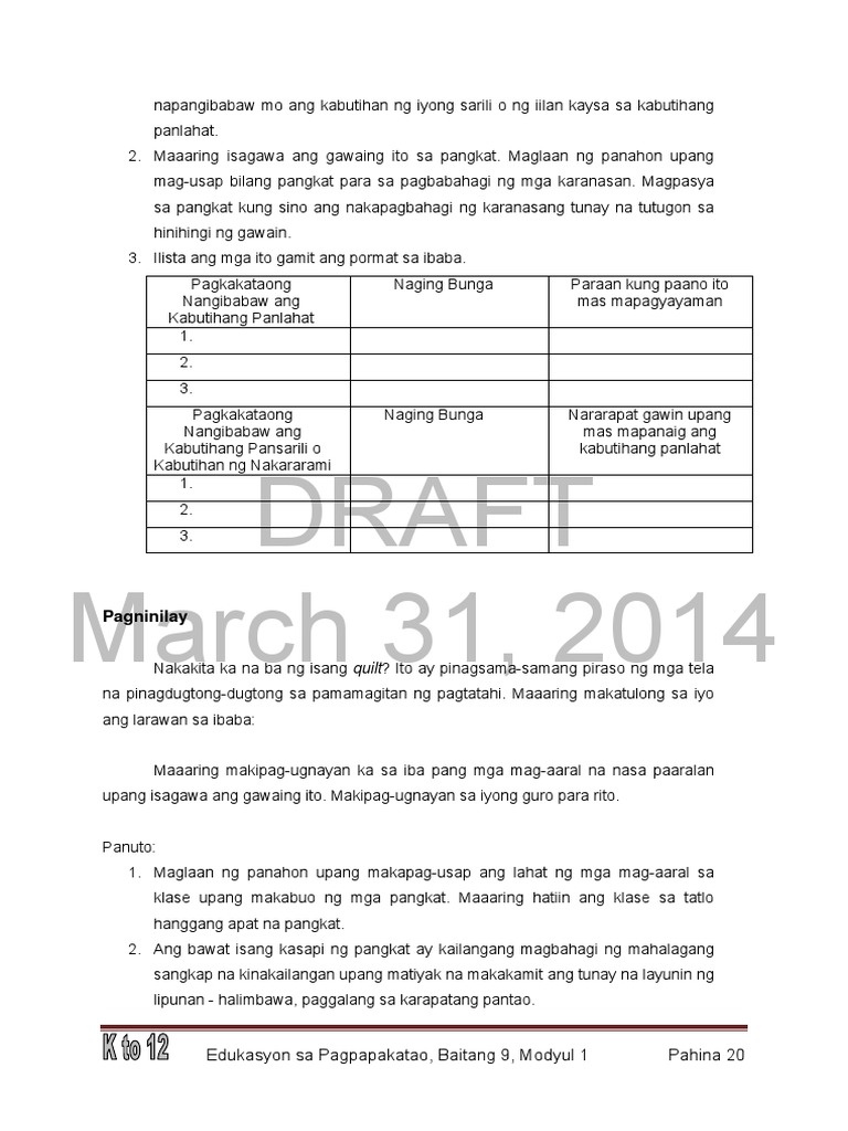 Pagkakataong nangibabaw ang. Sa gawaing ito ay magsagawa ka ng pagsusuri sa mga pagkakataon sa iyong buhay bilang isang mag-aaral at kabataan kung saan napangibabaw mo ang kabutihang panlabat at mas napangibabaw mo ang kabutihan ng iyong sarili o ng iilan kaysa sa kabutihang panlahat. Pagninilay Nakakita ka na ba ng isang quilt.