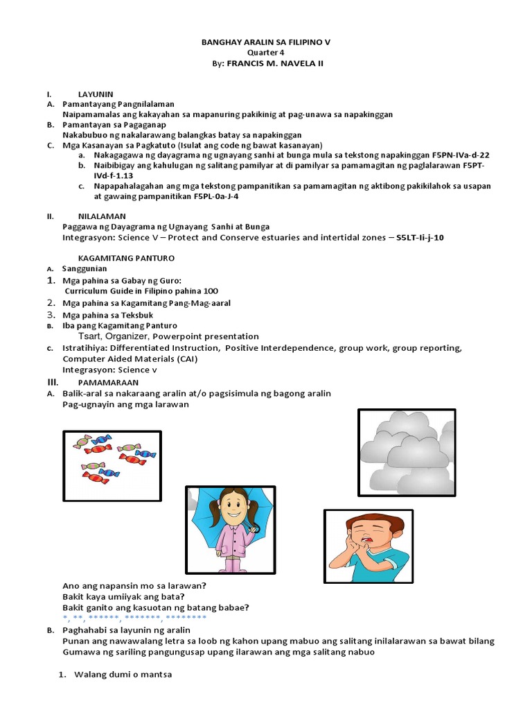 KONTEKSTUWALISADONG BANGHAY-ARALIN SA FILIPINO BAITANG 7 KWARTER 1. Magdamag na umiiyak ang sanggol sa loob ng bahay sanhi kaya hindi nakatulog na maayos si Aling Ester bunga. May 3 hanggang 4 na pahayag ang naitala.